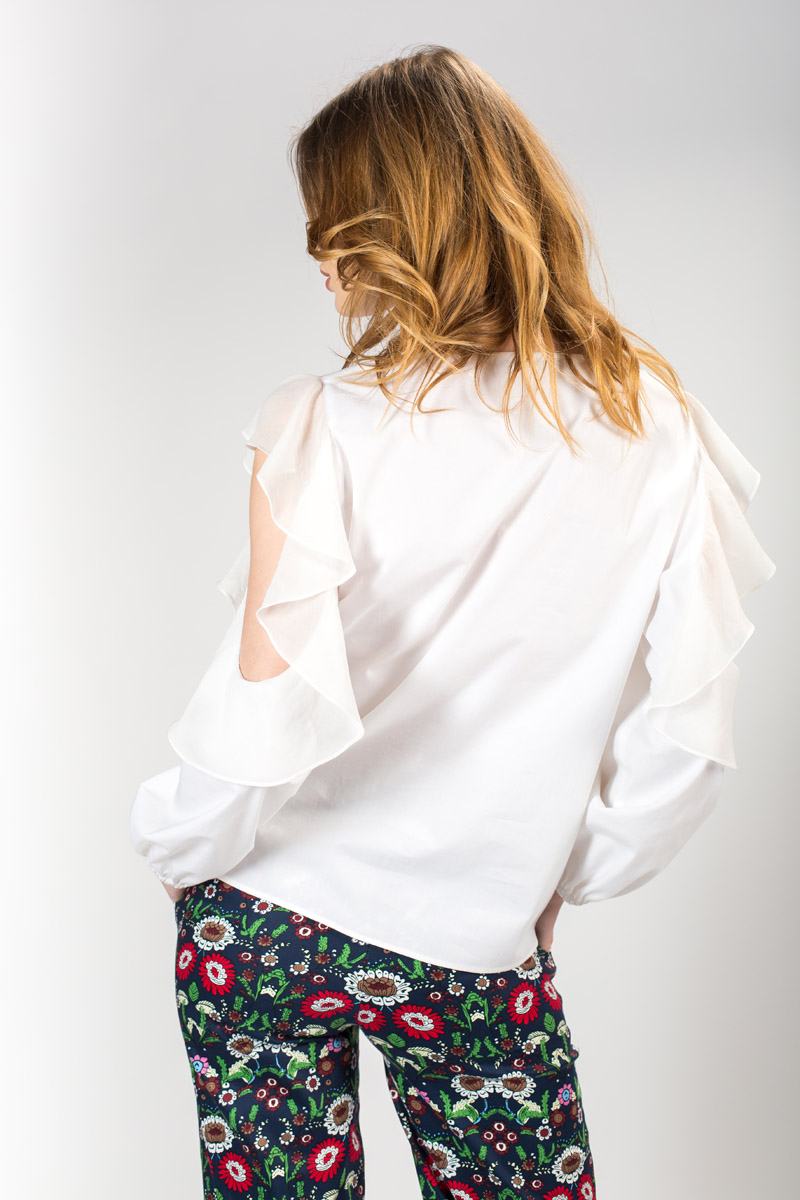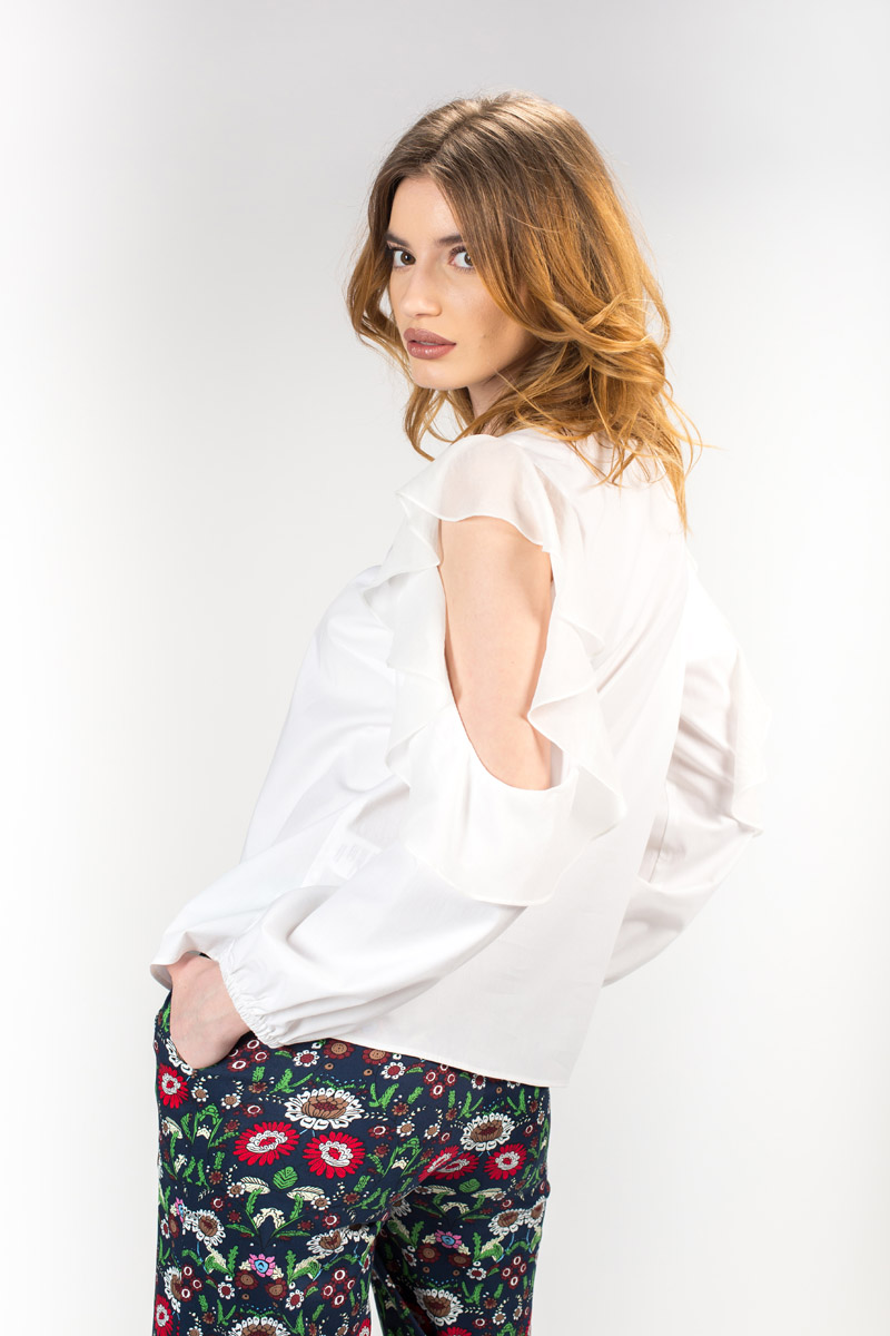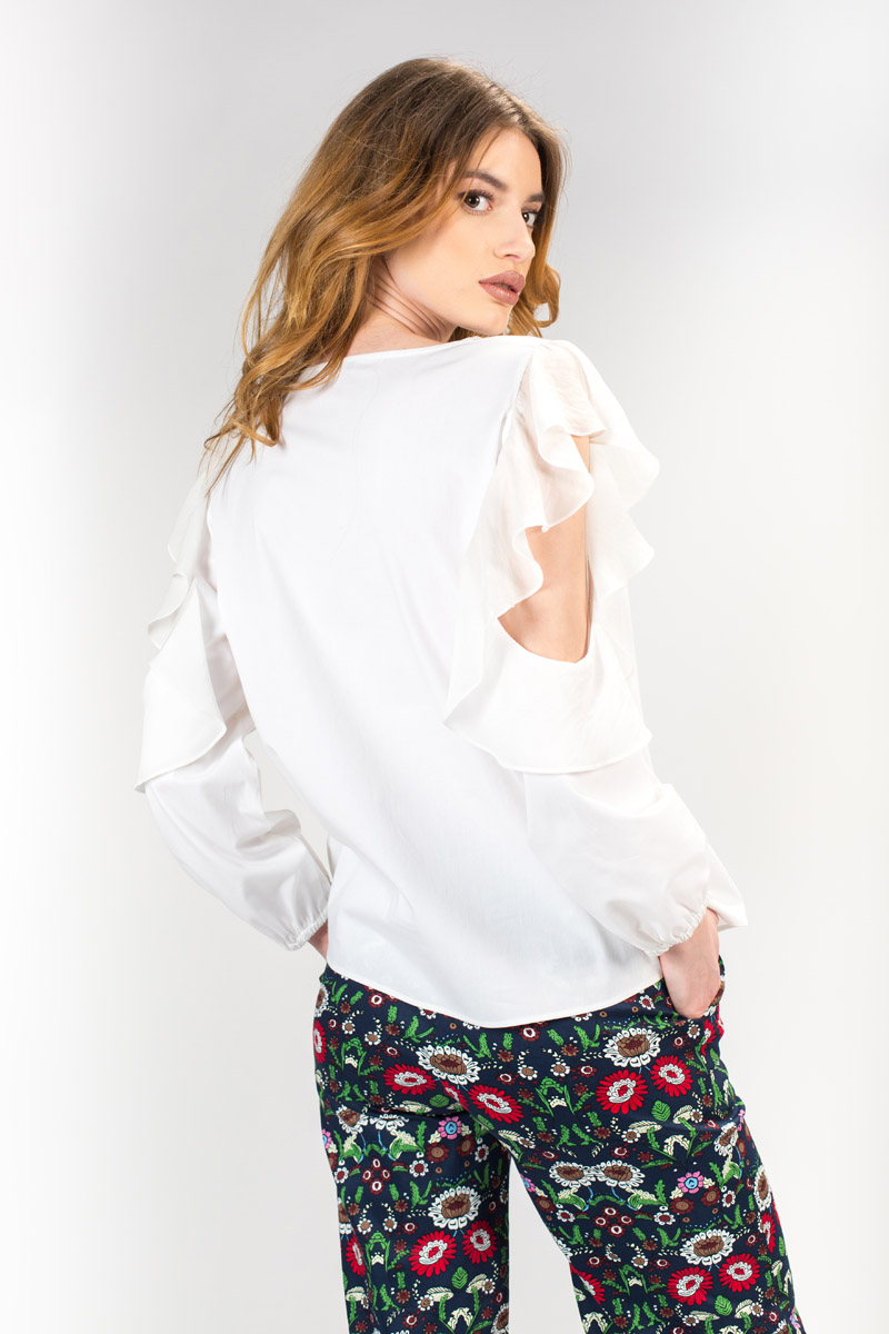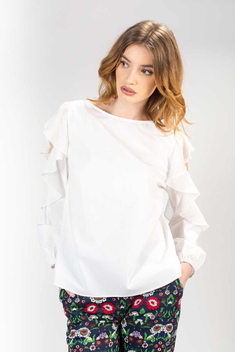 Bluza alba de dama cu maneca lunga si decupaj pe umar.Tot decupajul este accesorizat cu un volan.