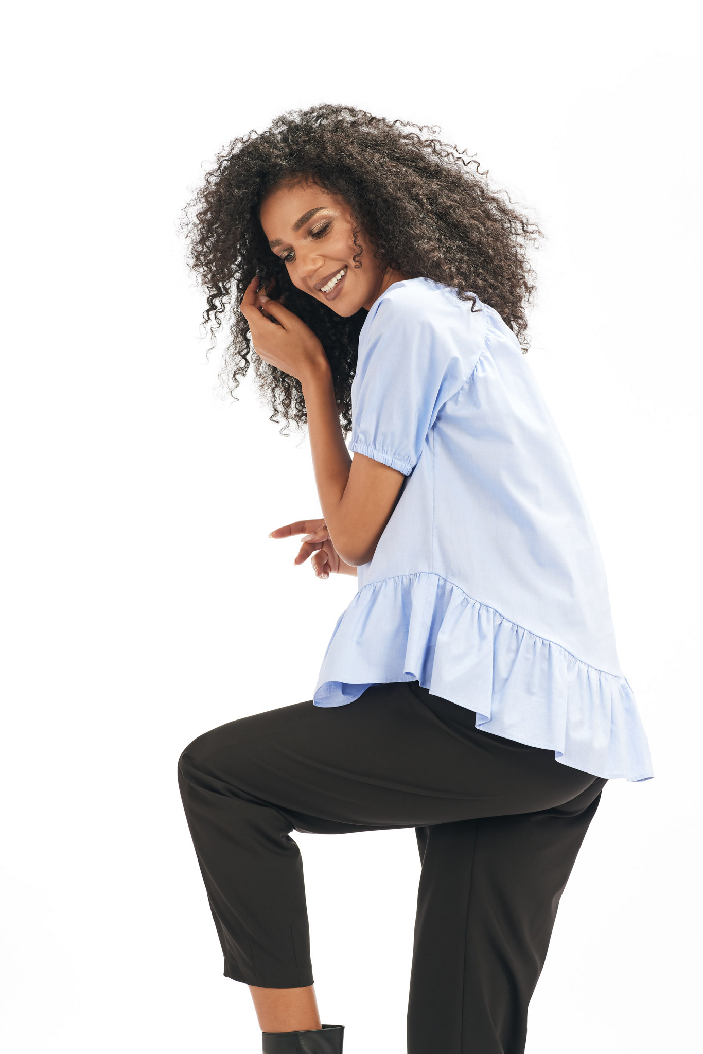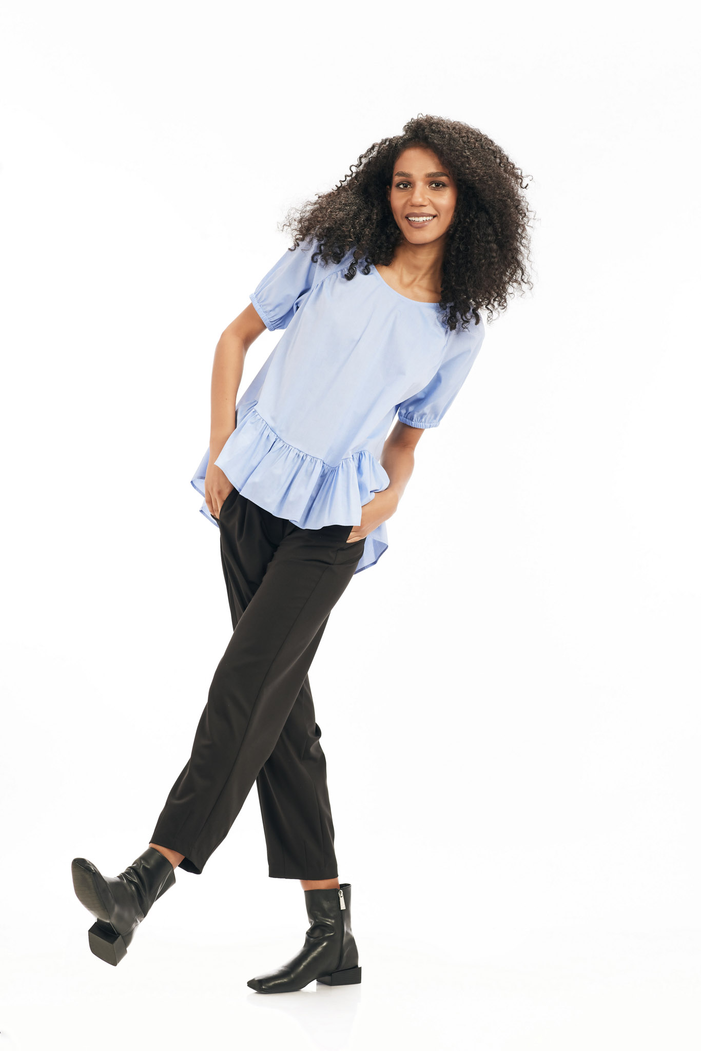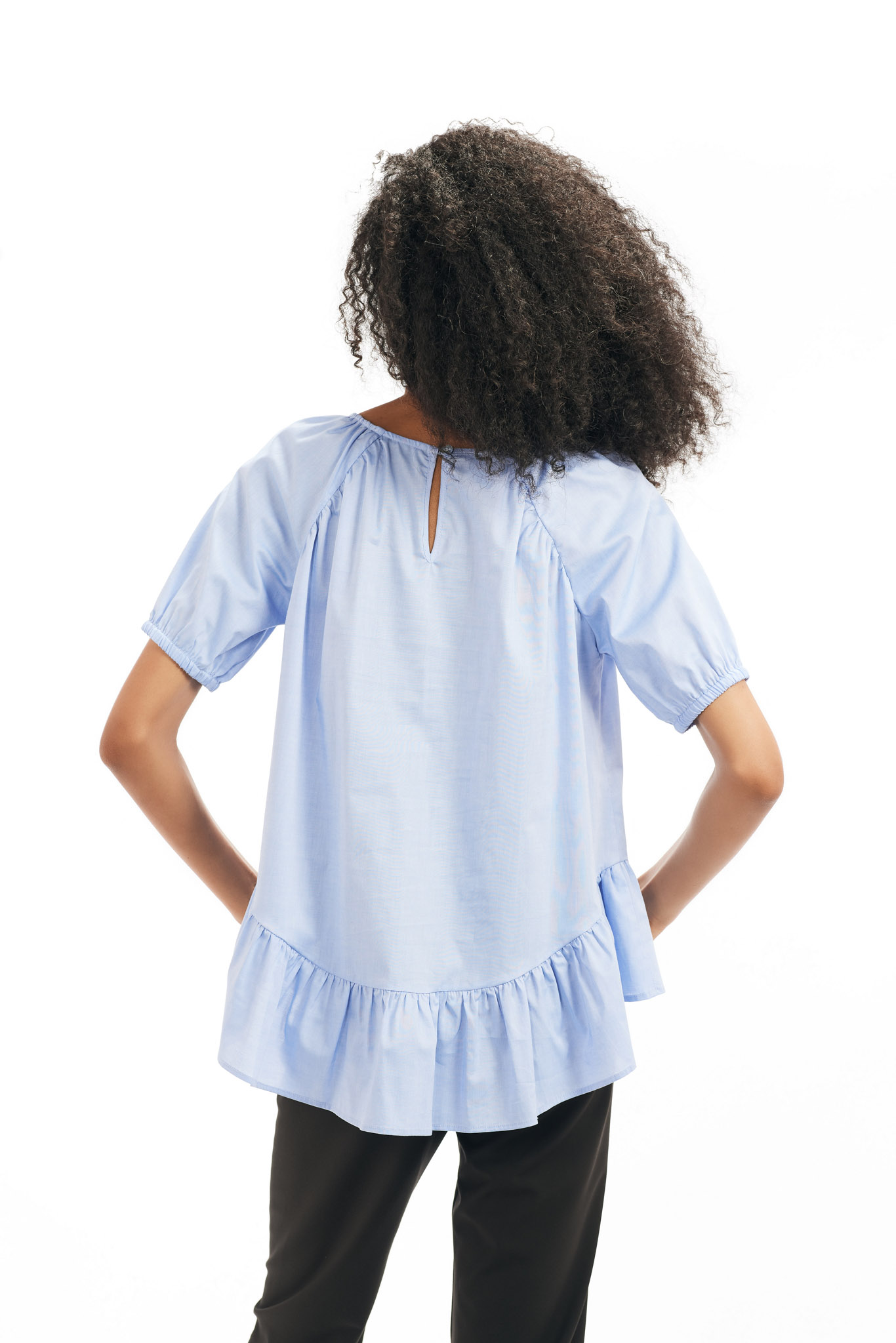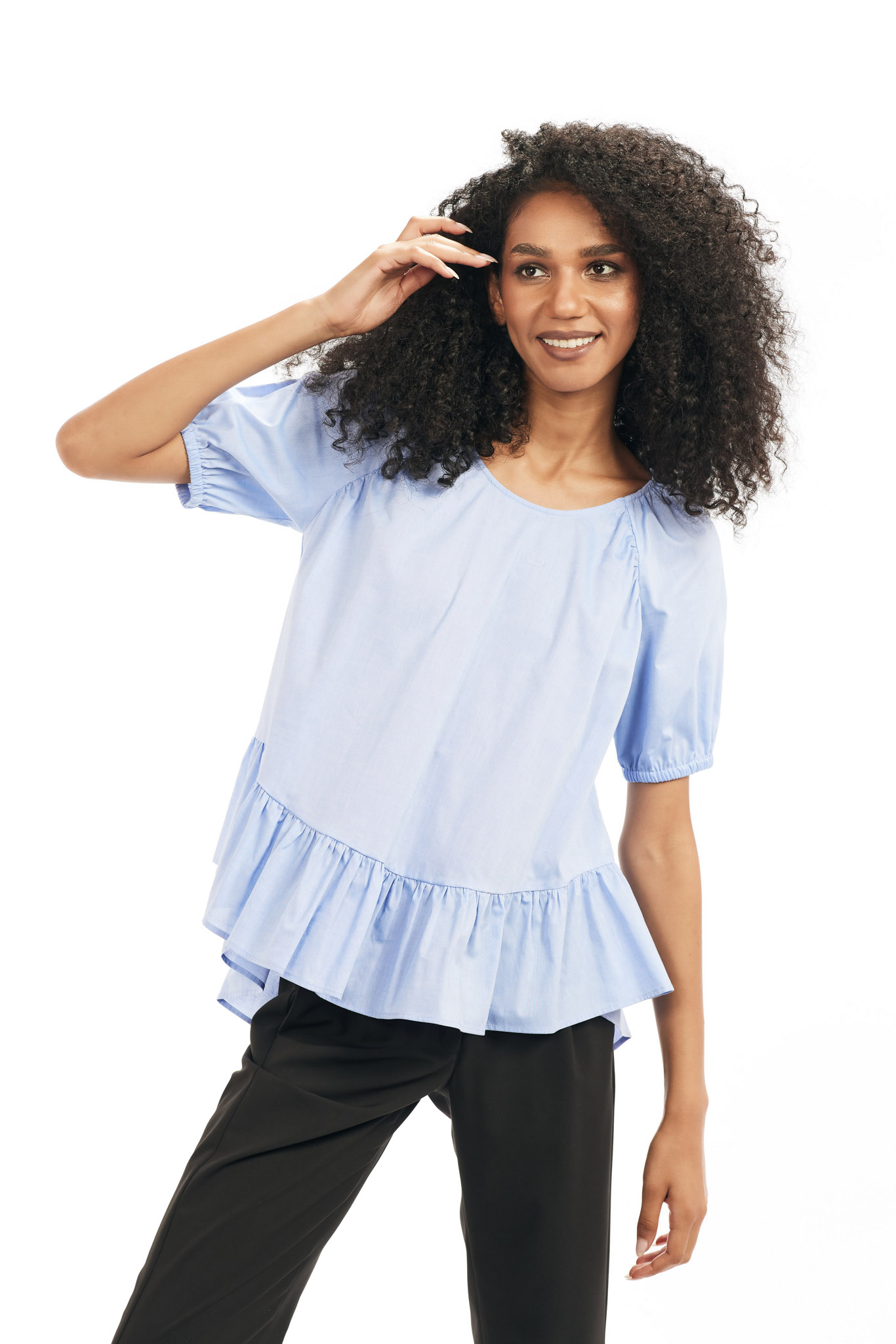 Bluza oversize din panza, cu volan, asimetrica, maneca raglan 3/4.