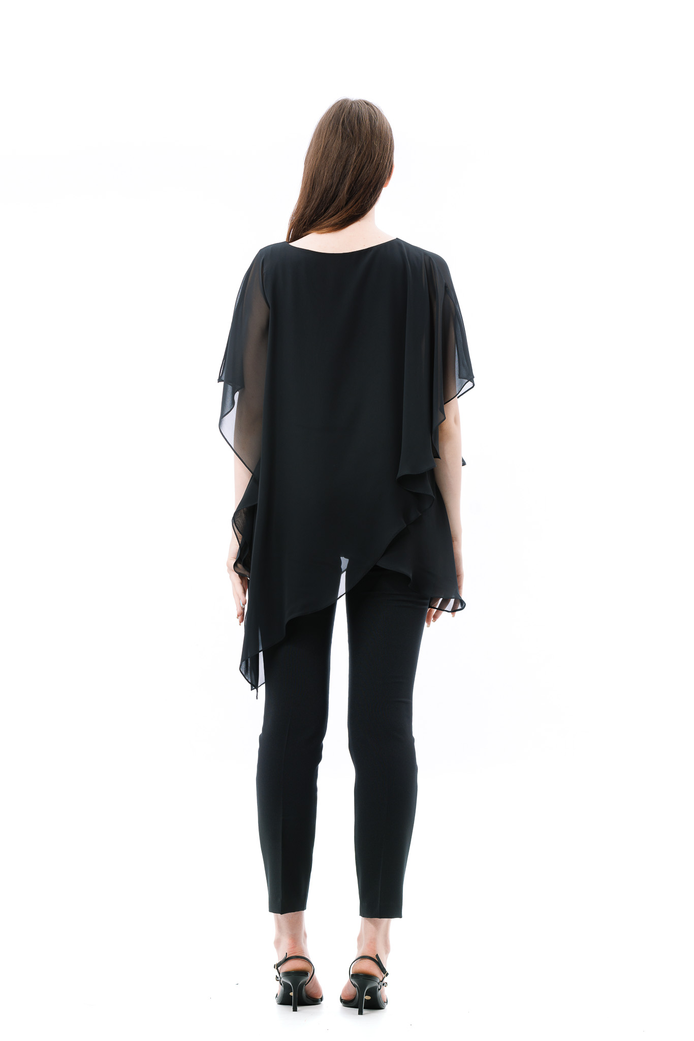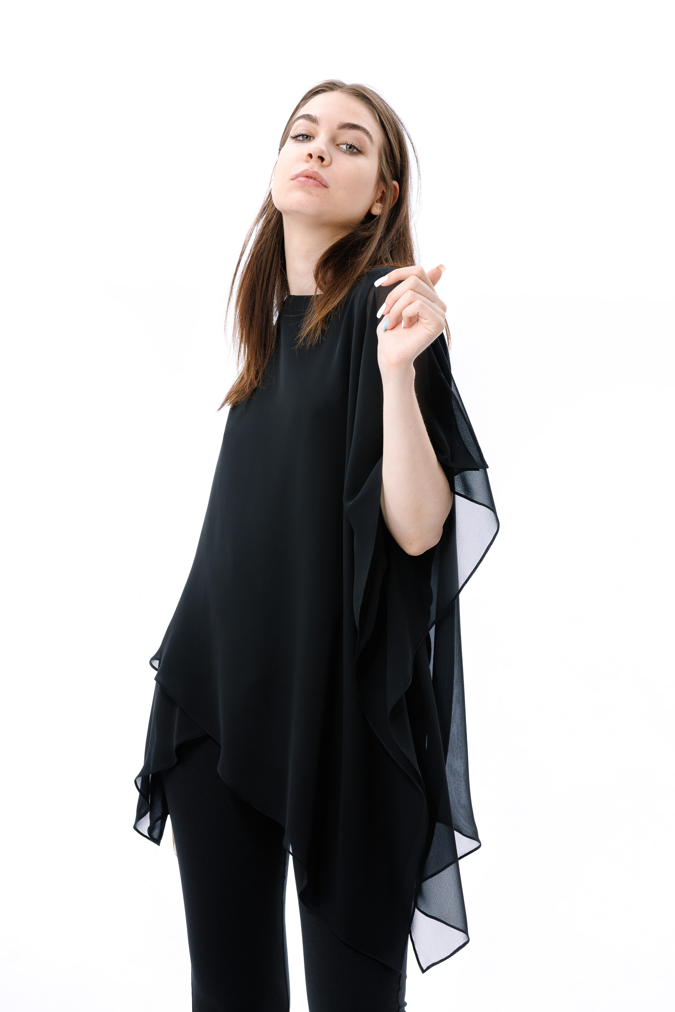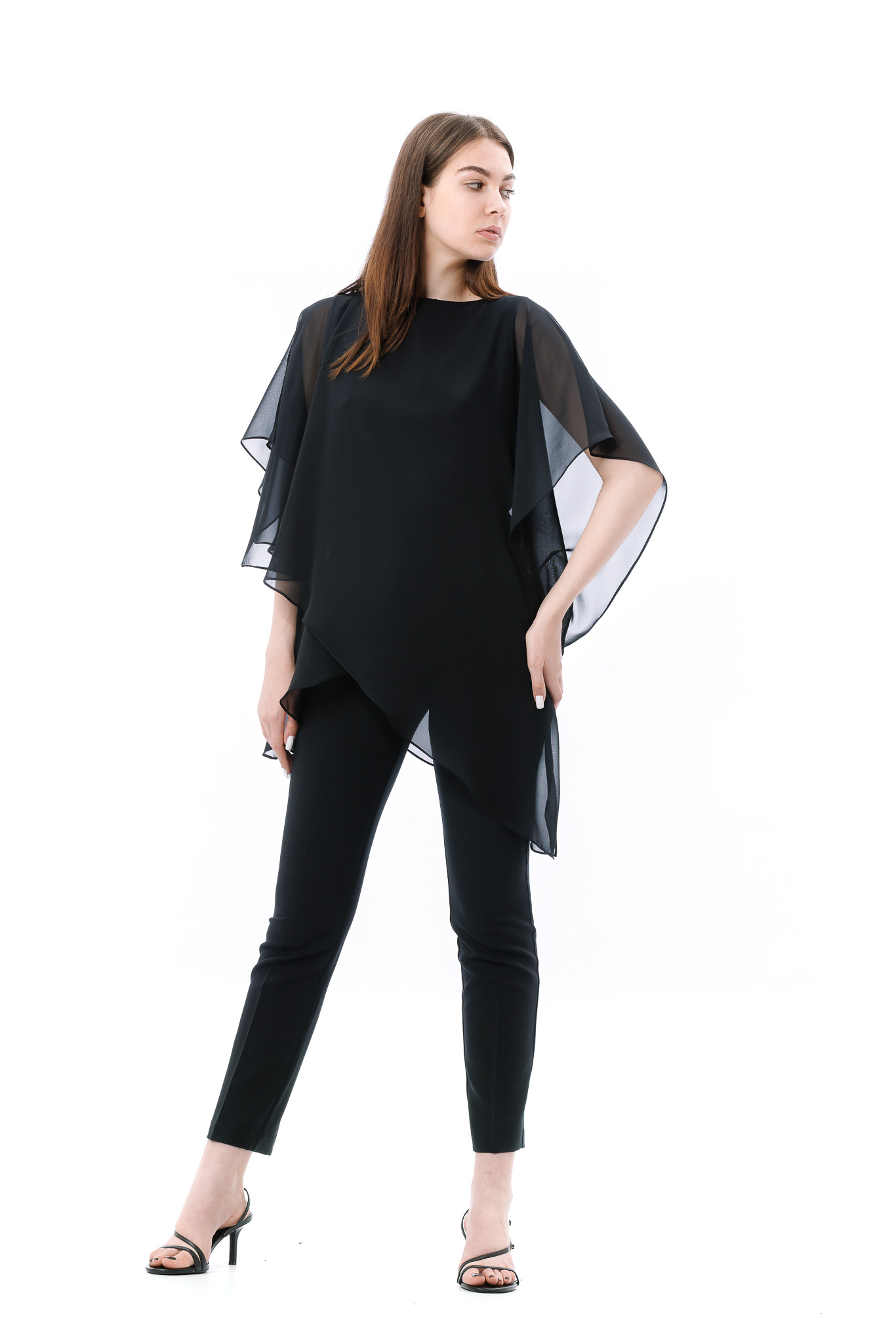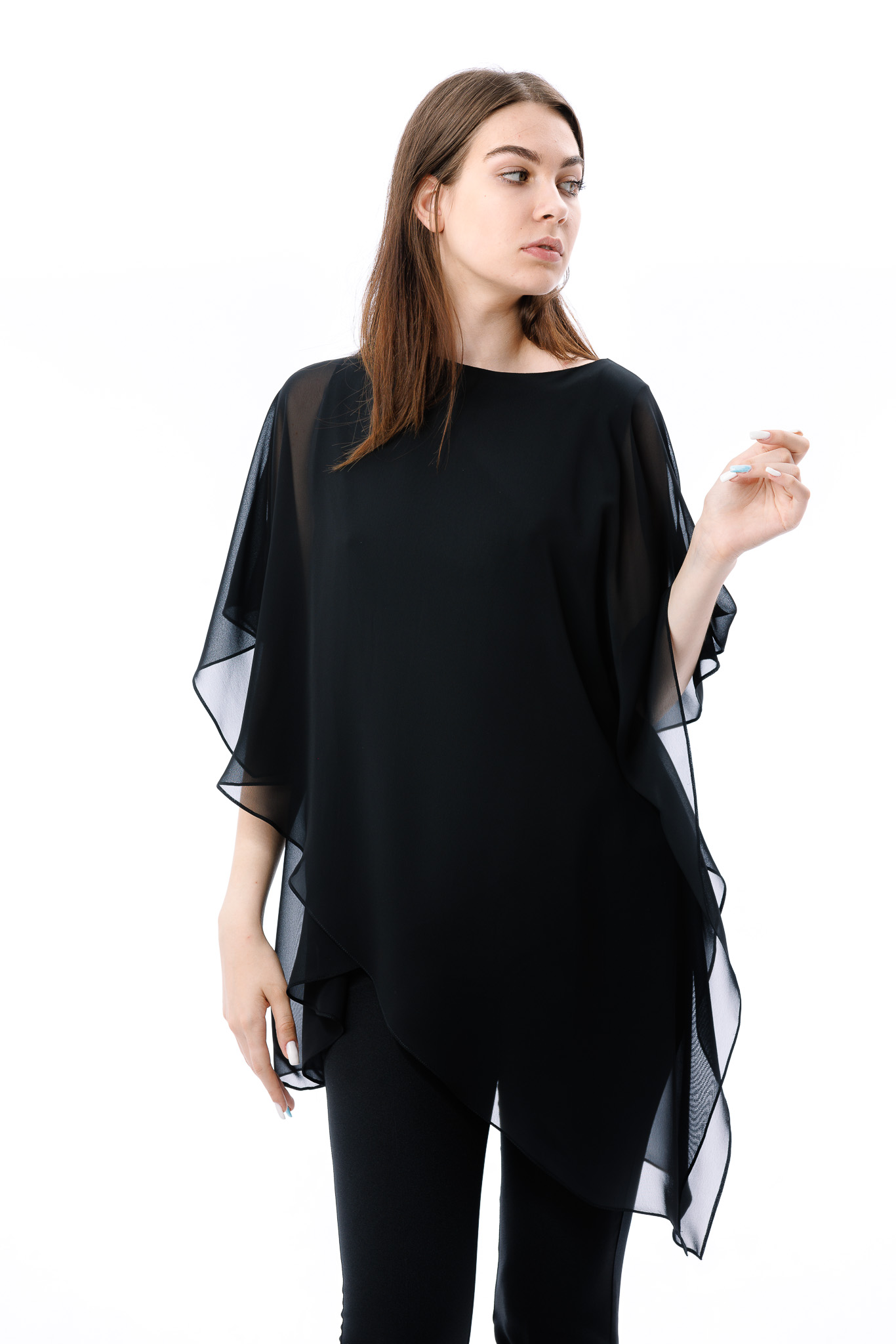 Bluza dama RVL, asimetrica, suprapusa atat in partea din fata, cat si in partea din spate. Pentru ca bluza este transparenta, aceasta are un top din bumbac pe dedesubt.