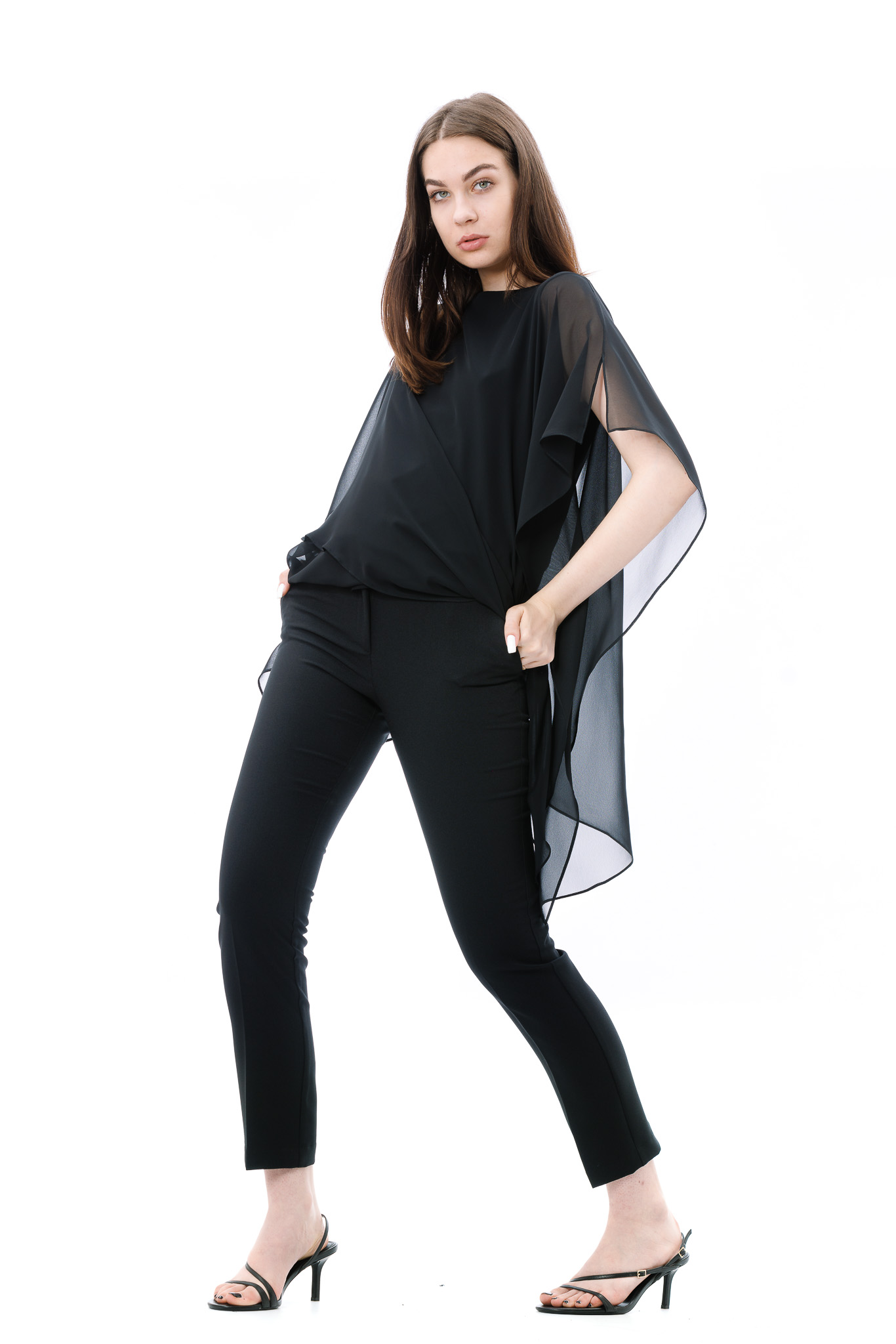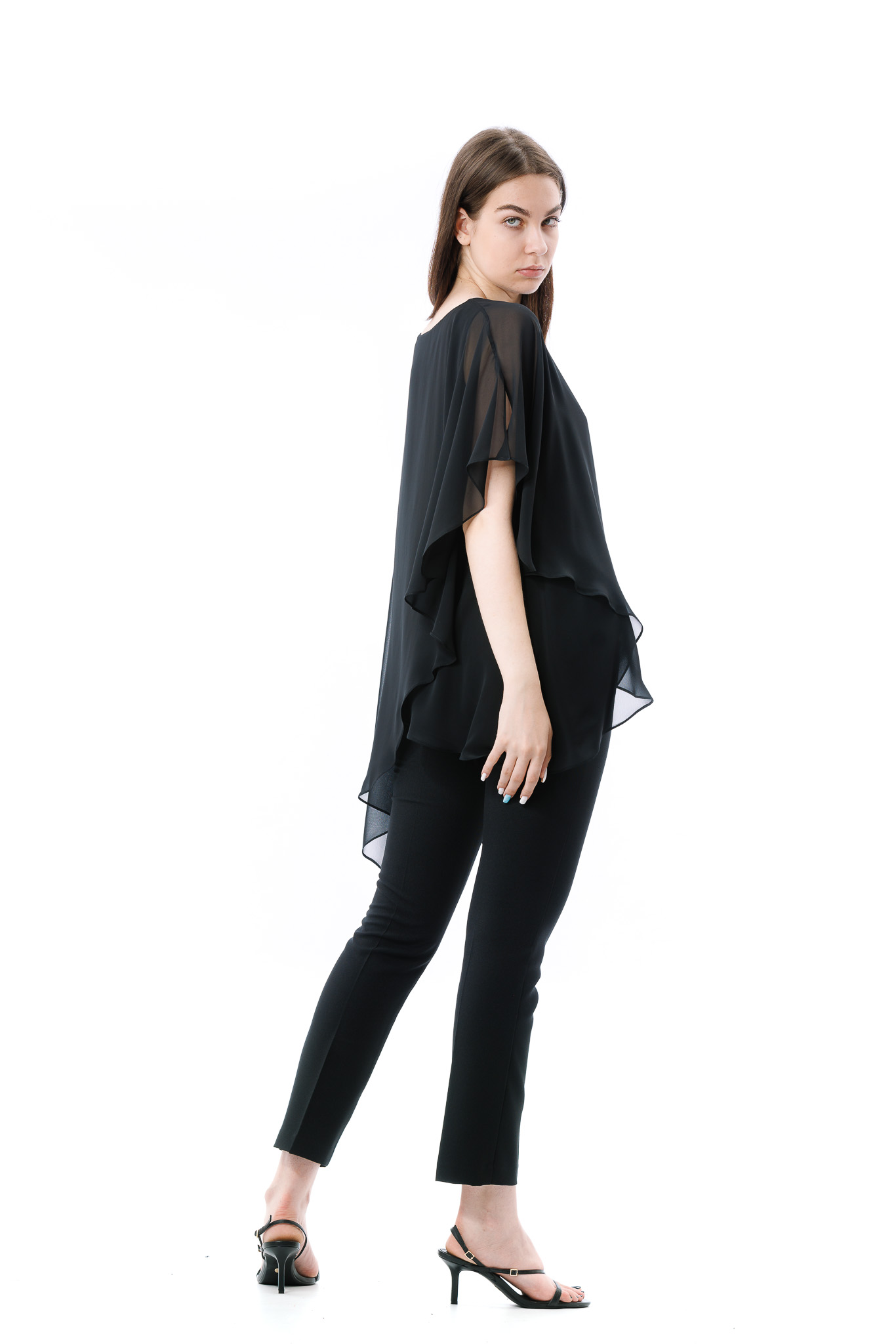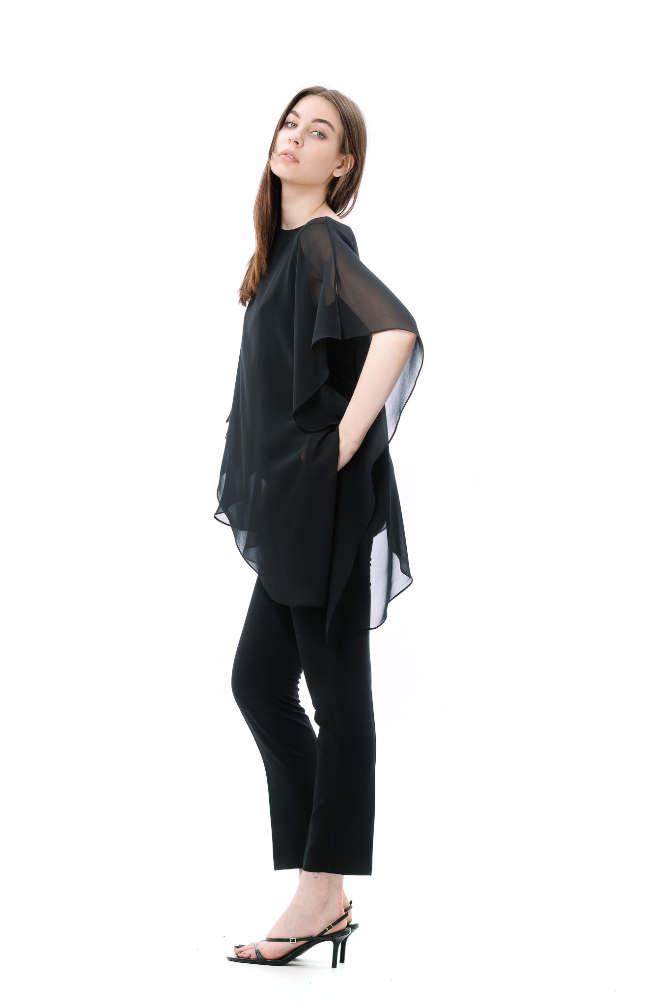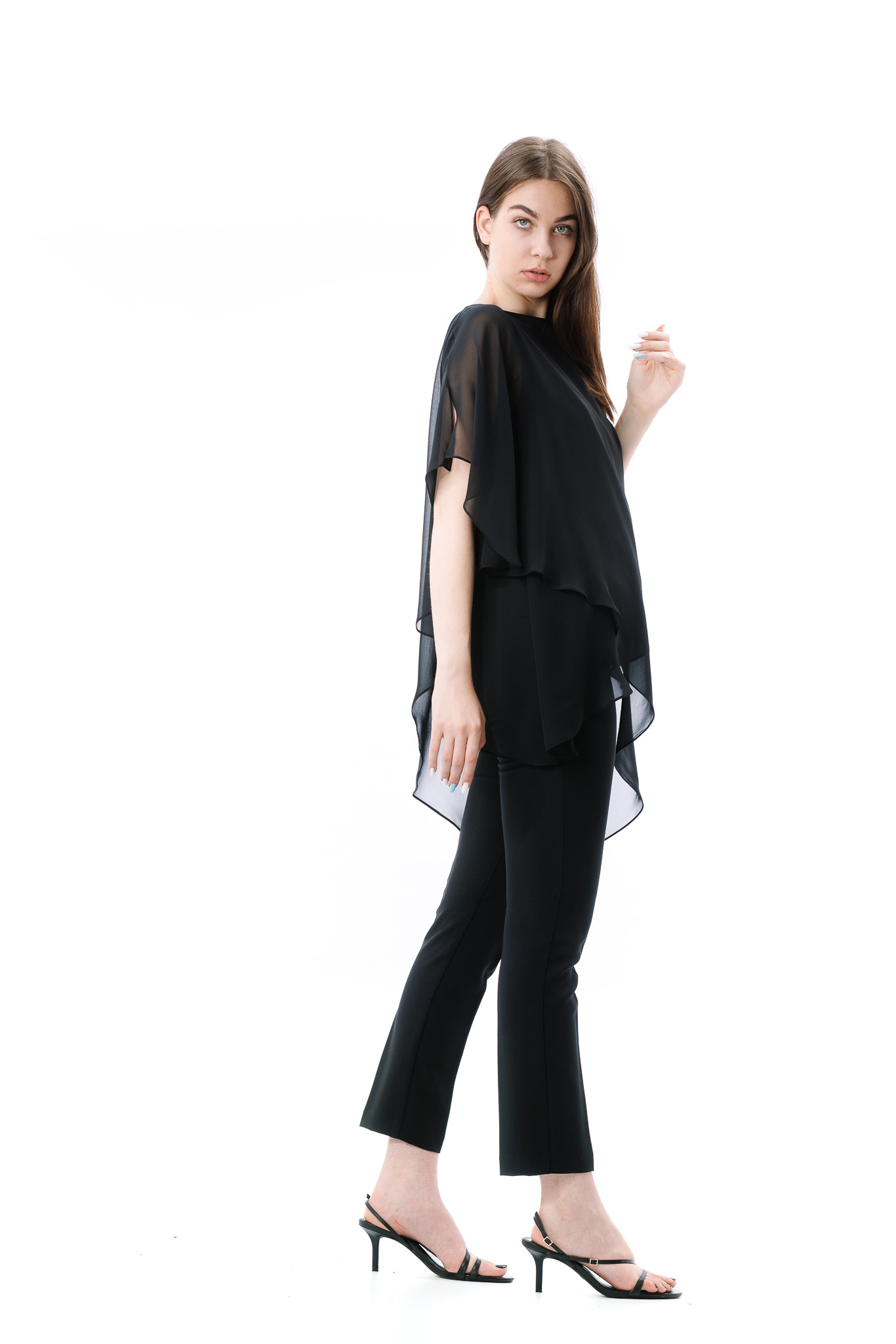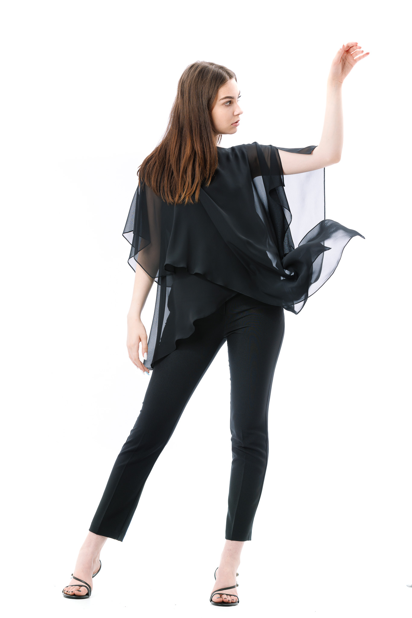 Bluza dama RVL, asimetrica, suprapusa atat in partea din fata, cat si in partea din spate. Pentru ca bluza este transparenta, aceasta are un top din bumbac pe dedesubt.
