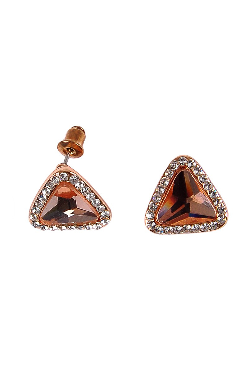 Cercei aurii in forma triunghiulara, in mijloc au un cristal auriu iar pe margine un rand de cristale albe micute. Se prind cu ac si dop metalic. Dimensiuni: 1,3 cm