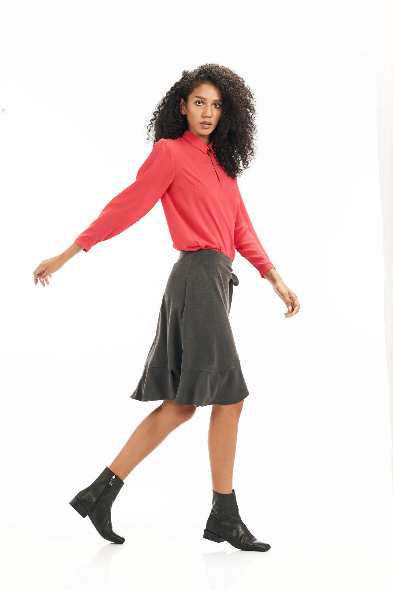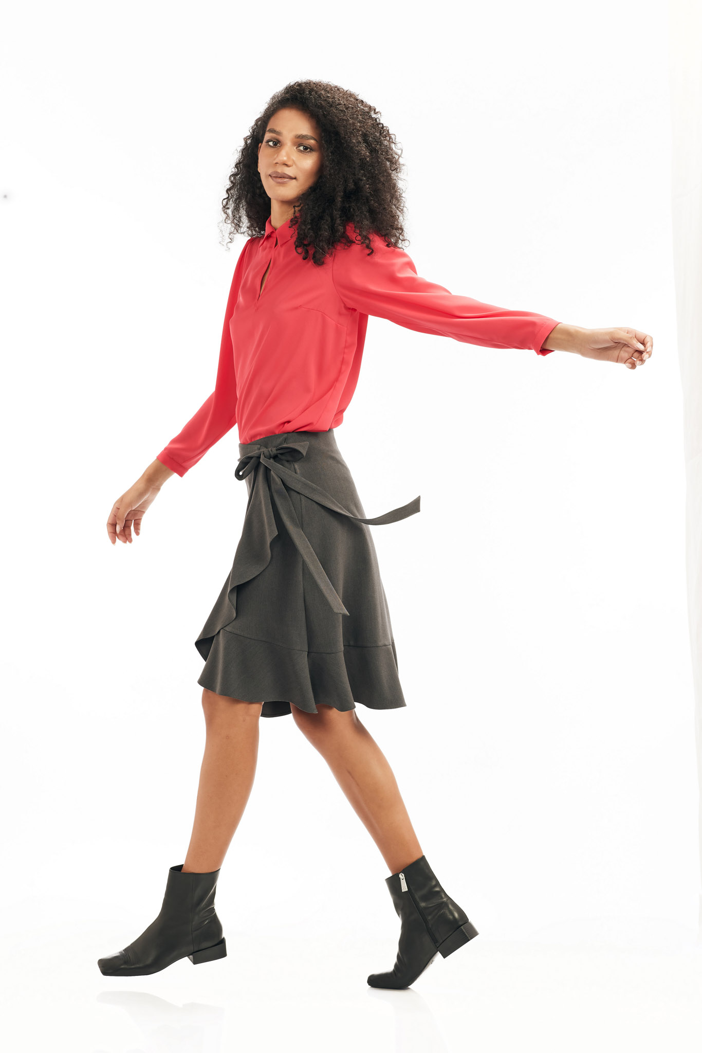 Fusta evazata, parte peste parte, cu volan, inchidere cu cordon.