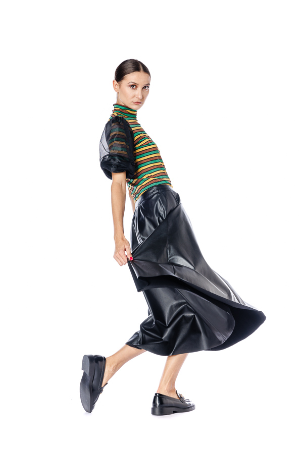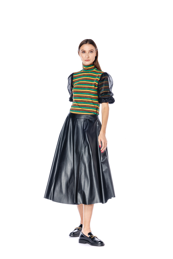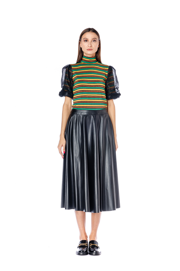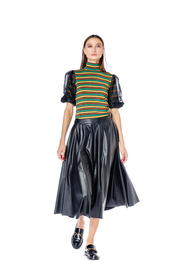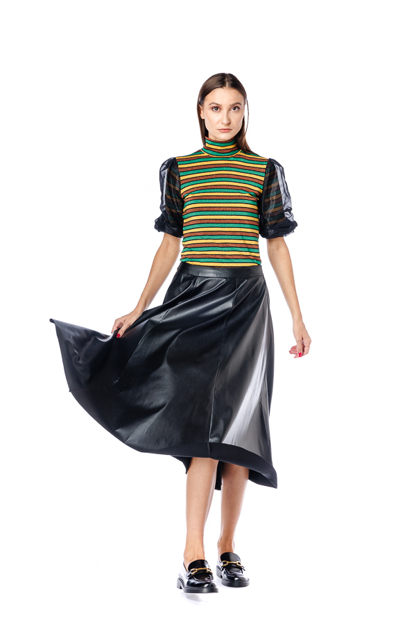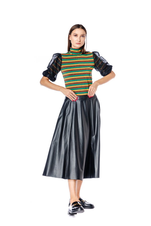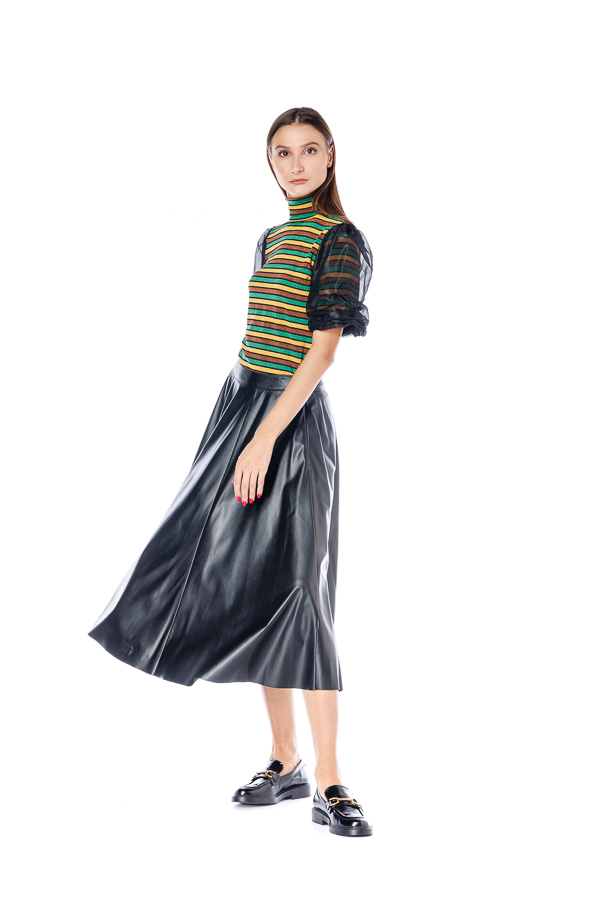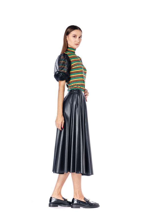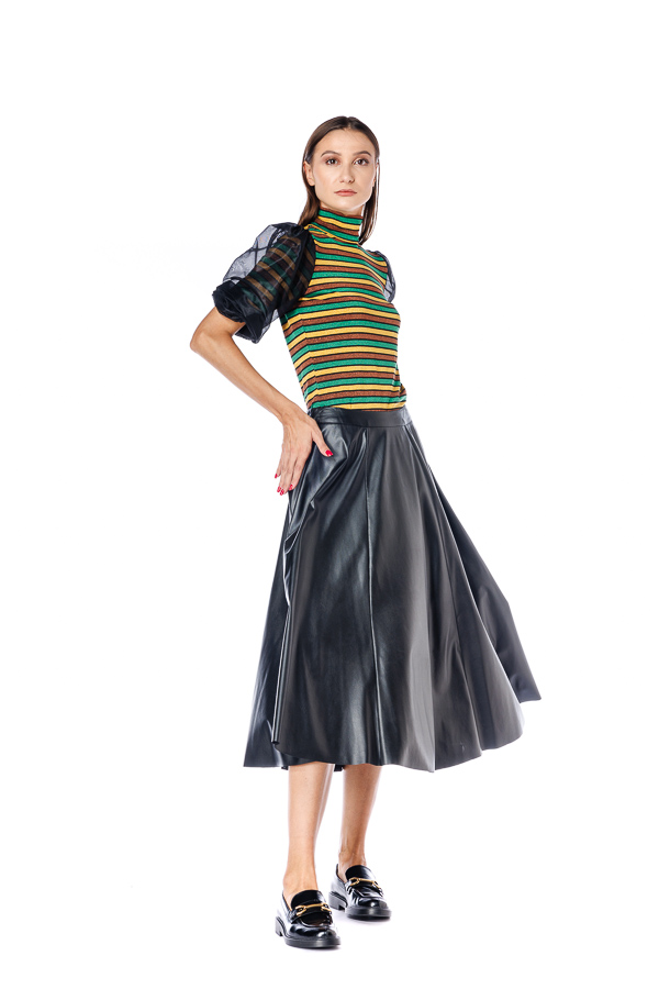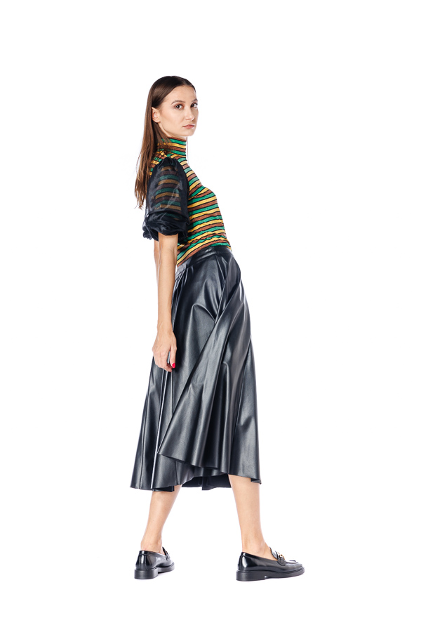 Fusta ampla, din piele eco RVL, casual, uni, incretita, midi, inchidere laterala cu fermoar. Fusta se preteaza atat pentru tinute de zi cu zi, cat si pentru tinute cocktail. Lungimea sa avantajează orice siluetă și ascunde subtil micile imperfecțiuni.