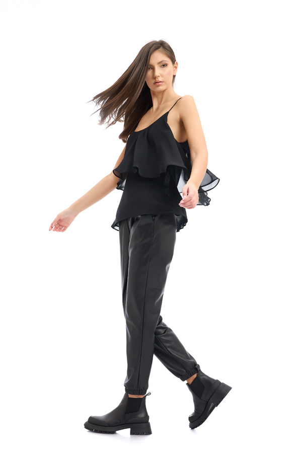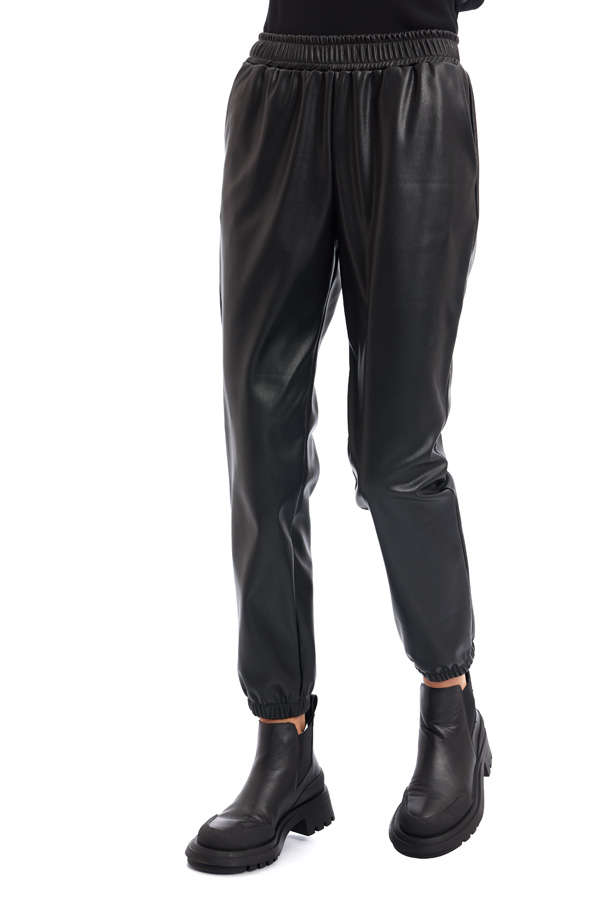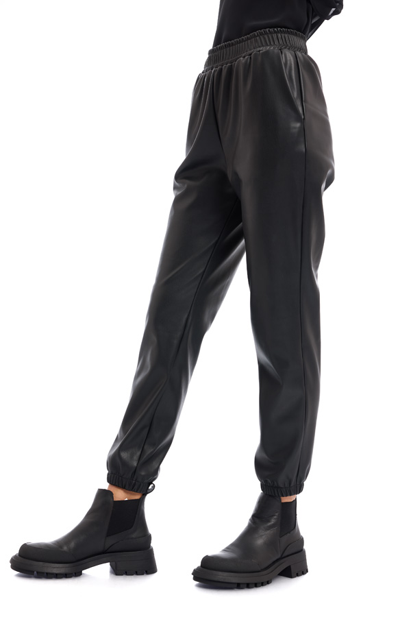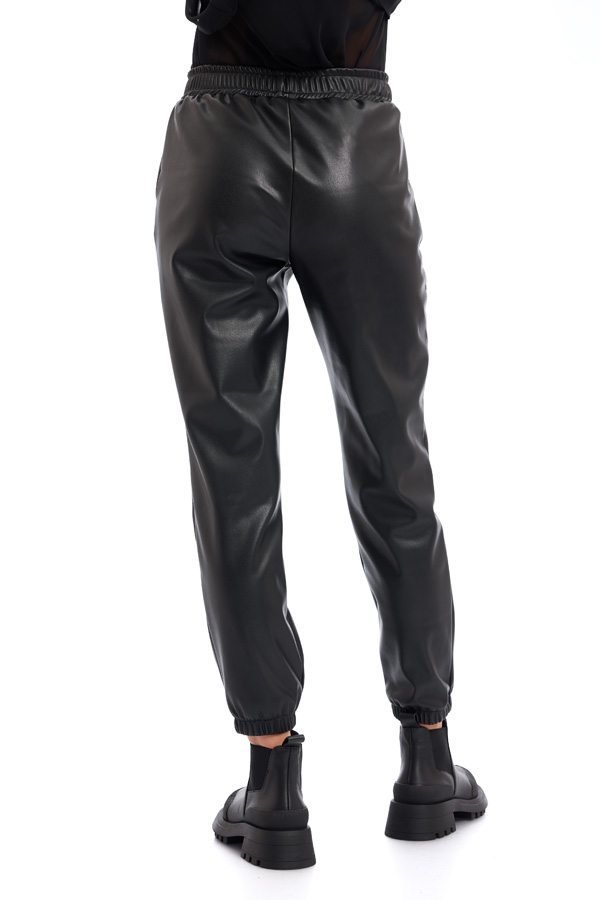 Pantalon jogger din piele ecologica, cu buzunare laterale si elastic la terminatie.