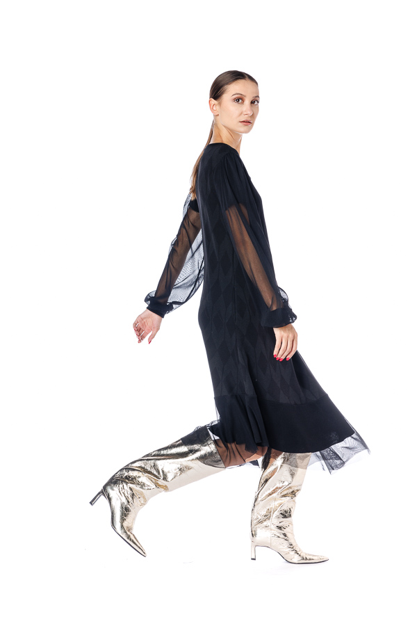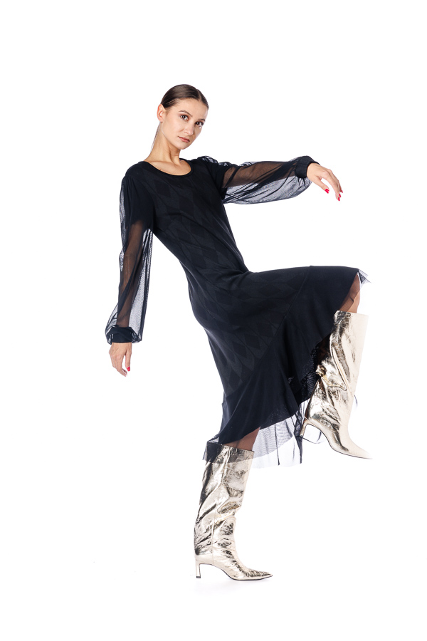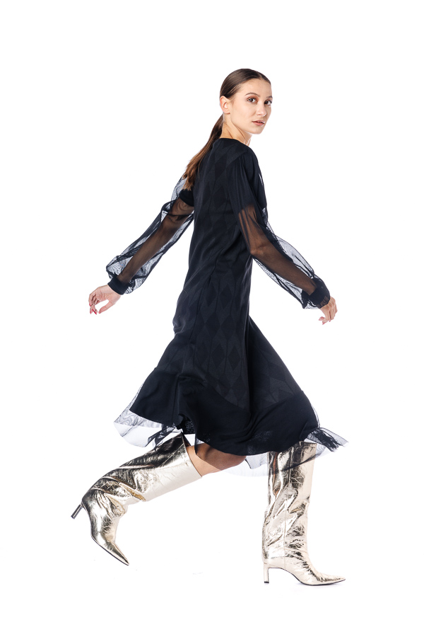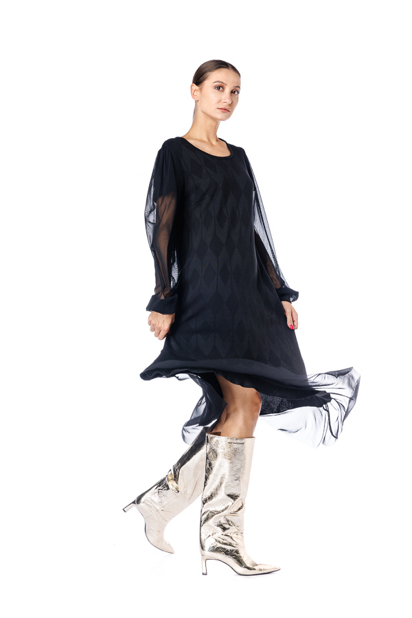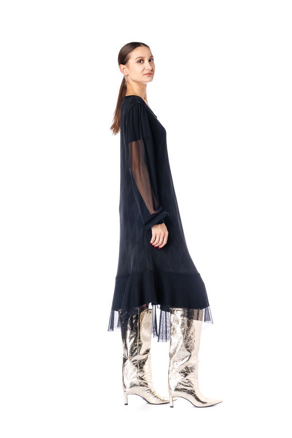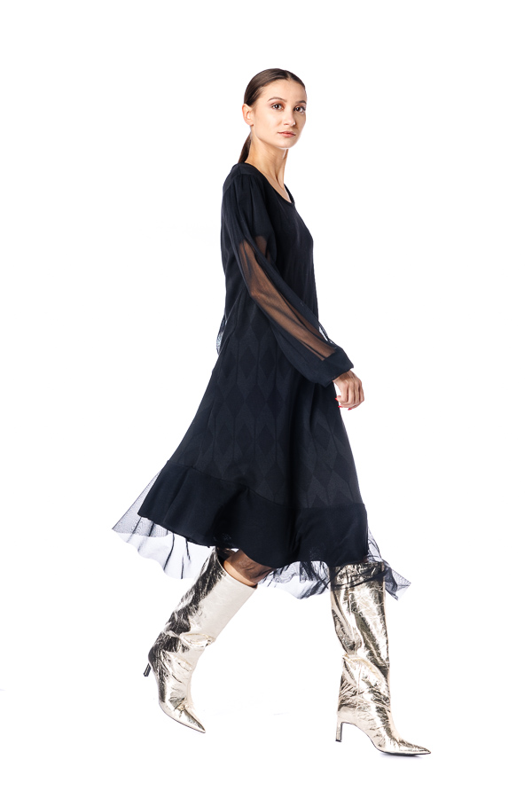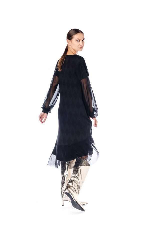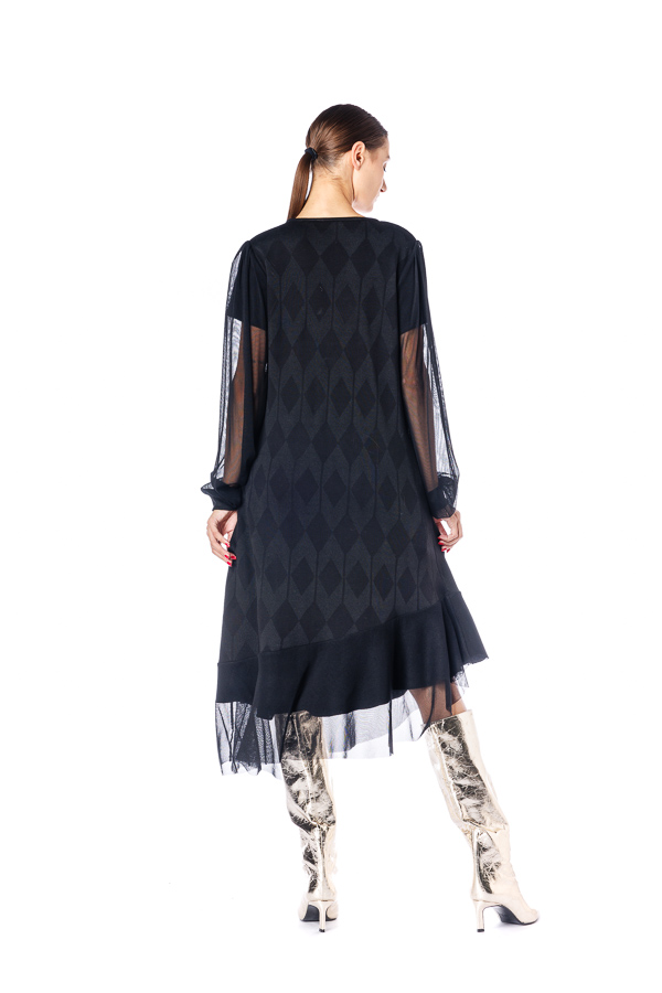 Rochie neagra RVL, din viscoza , asimetrica, midi, casual, cu un croi lejer, maneca lunga din tulle si volan la terminatie. Rochia este perfectă pentru zilele frumoase de toamna .