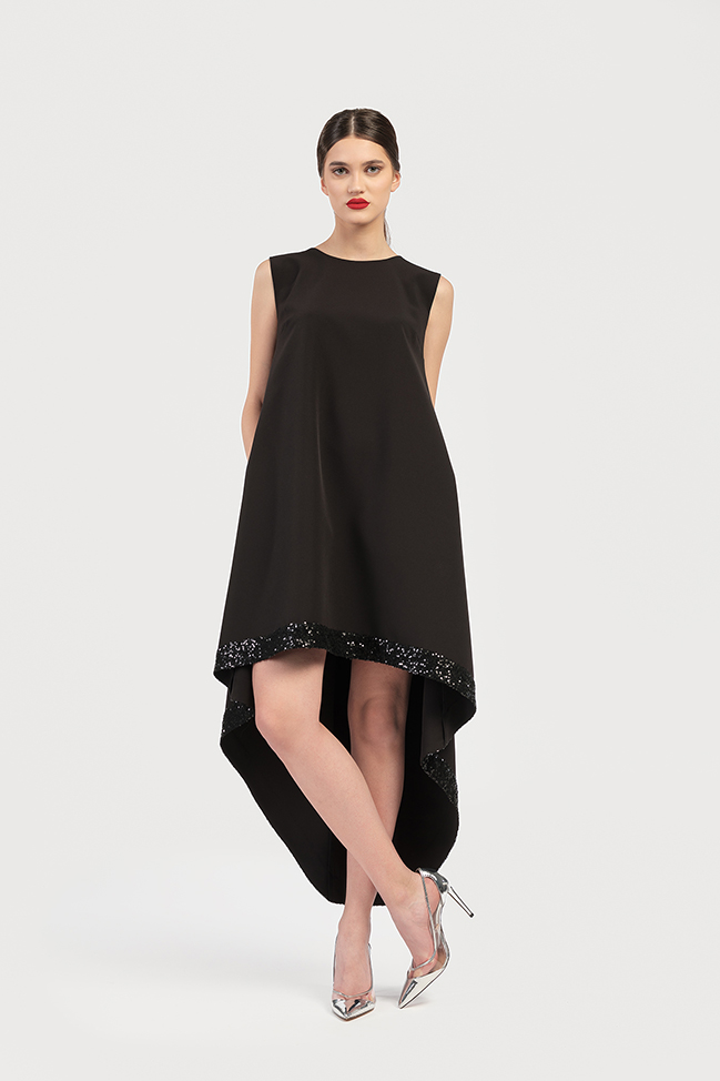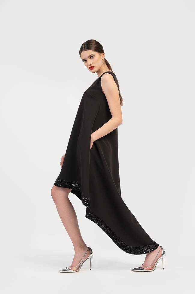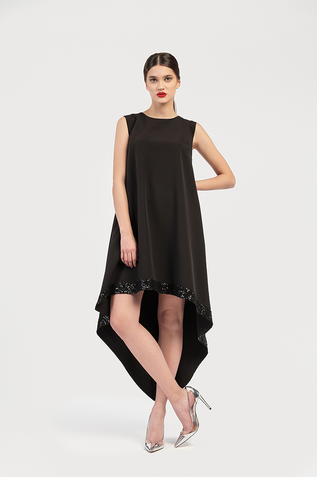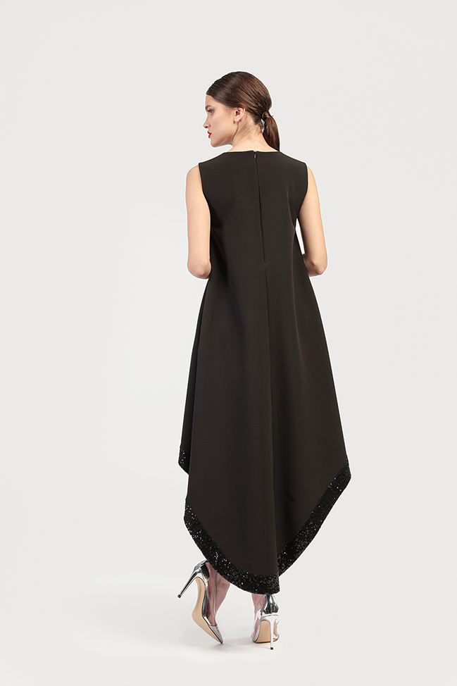 Rochie cocktail, asimetrica, fara maneci, cu un croi lejer si terminatie din paiete.