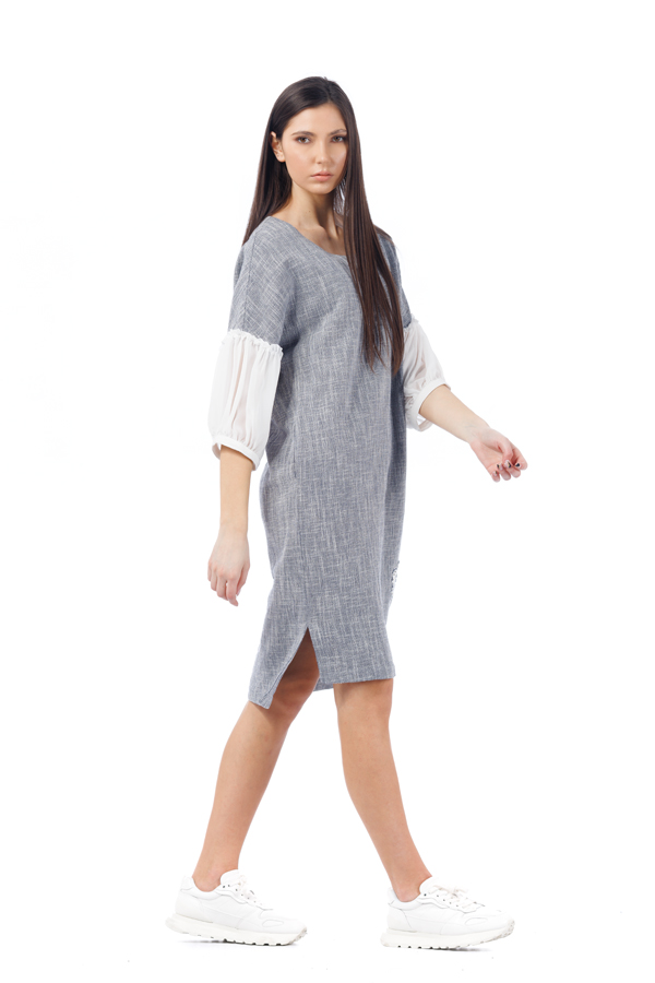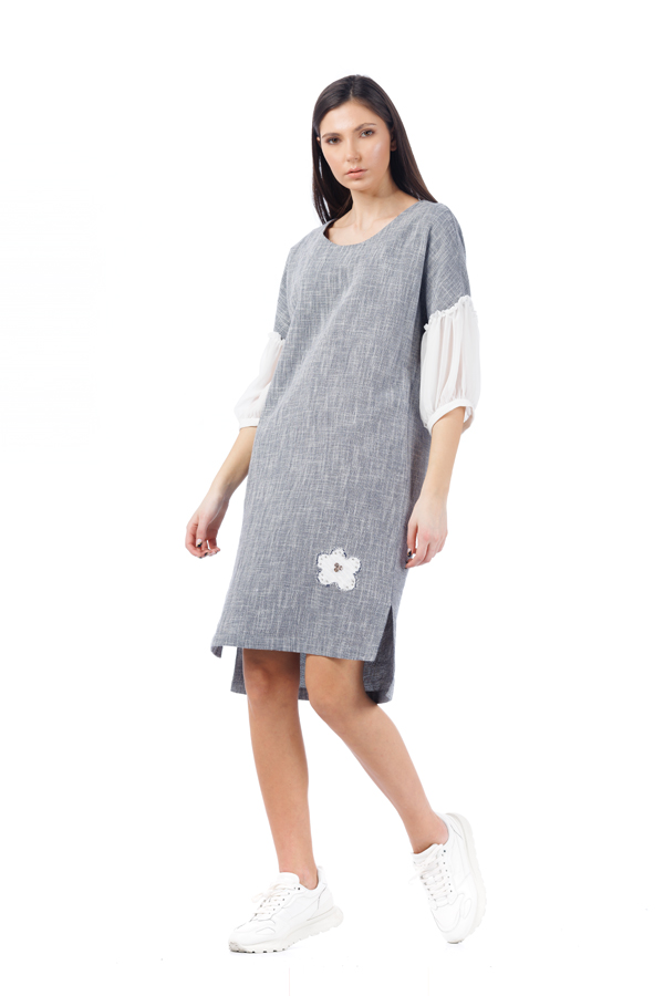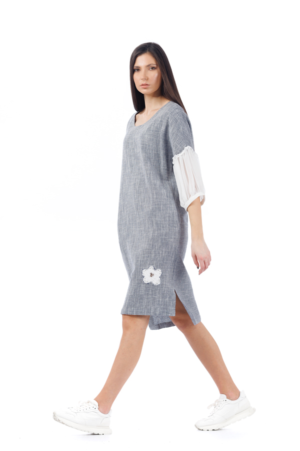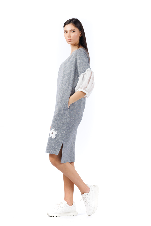 Rochie din in RVL, gri, asimetrica, lejera, midi, cu slituri laterale, maneci din tulle usor incretite si detalii florale cusute manual.